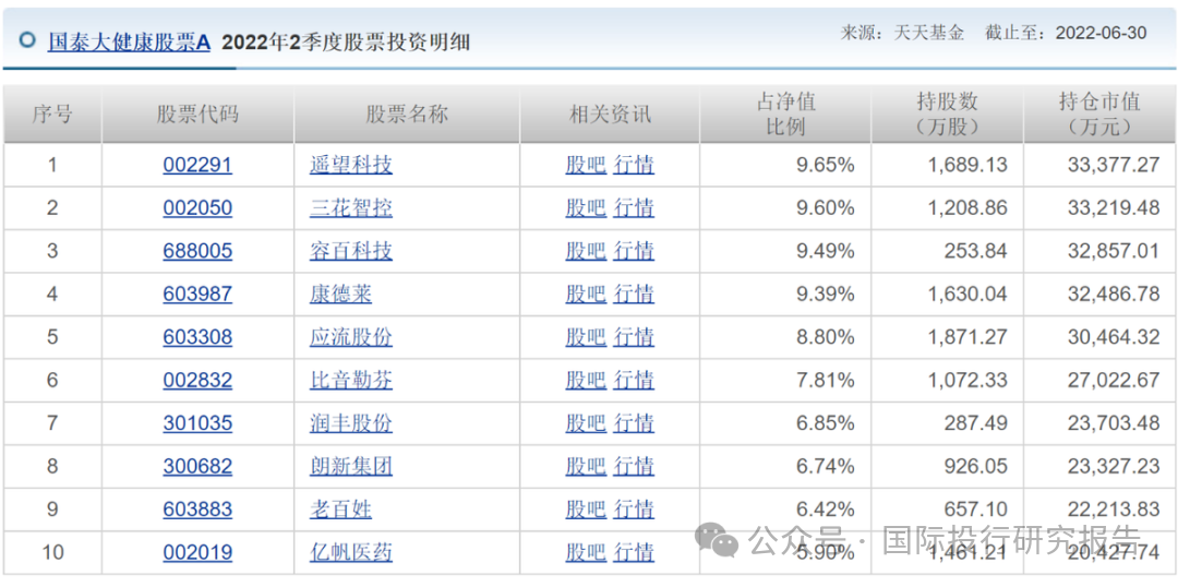 从国泰大健康股票的持仓来看,2022年一些新能源、科技类的个股开始进入该基金的前十大持仓股中。比如,2022年二季度末,遥望科技、三花智控、容百科技成为该基金的前三大持仓个股。