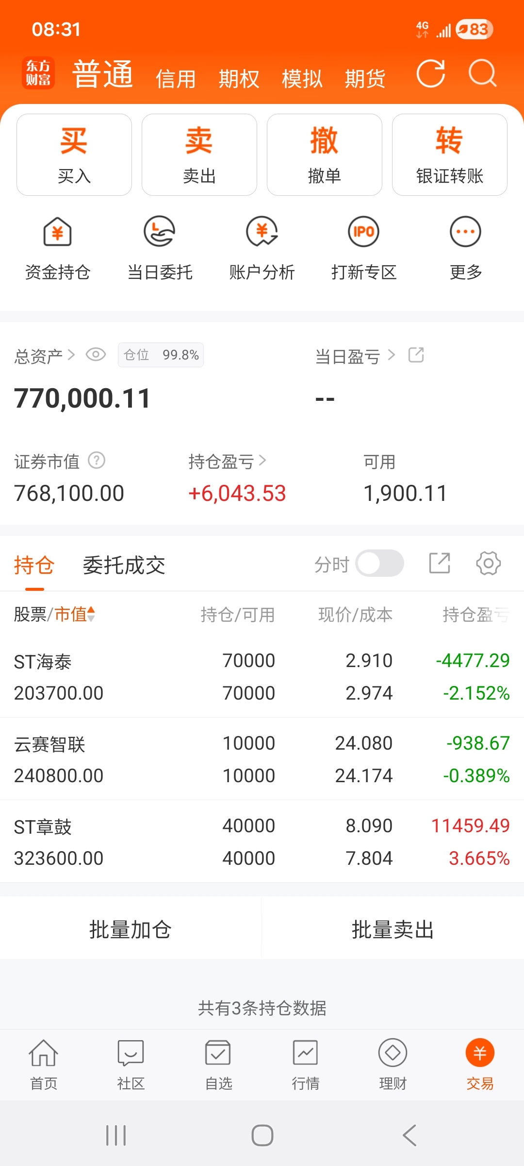 $ST章鼓(SZ002598)$ $ST海泰(SH600082)$ $云赛智联(SH600602)$ 习惯了红绿跳动周末很无聊浑身不得劲,世界很热闹,只有我在等开盘。今年生意不好做,截止目前亏损接近中位数(据豆包统计约-8.5%),可谓是惨淡经营。手中三支票均是地方国资控股,拿着还算比较踏实,尤其是二支ST票貌似机会大于风险,希望早日困境反转脱胎换骨。高手说炒股不是生活的全部,但不少股民最大的快乐在股市,如我如你。祝大家周末愉快,明日有钱赚!