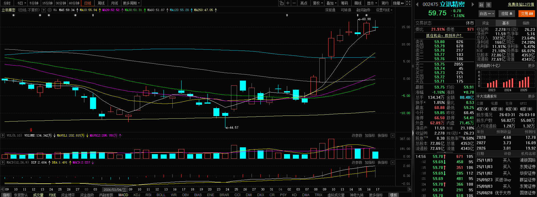 $立讯精密(SZ002475)$:本周小幅上涨,收盘在59.8附近,较上周五的58.8略有上升。周初延续强势,一度站上60元,但后半周回踩,60元得而复失。量能缩量,回调温和,属于正常的技术性整理。消费电子板块整体趋势仍在。老白继续持有。下周看59.5-60区域的争夺,若能重新站回60,则趋势延续;若继续回踩,留意58-59支撑。
