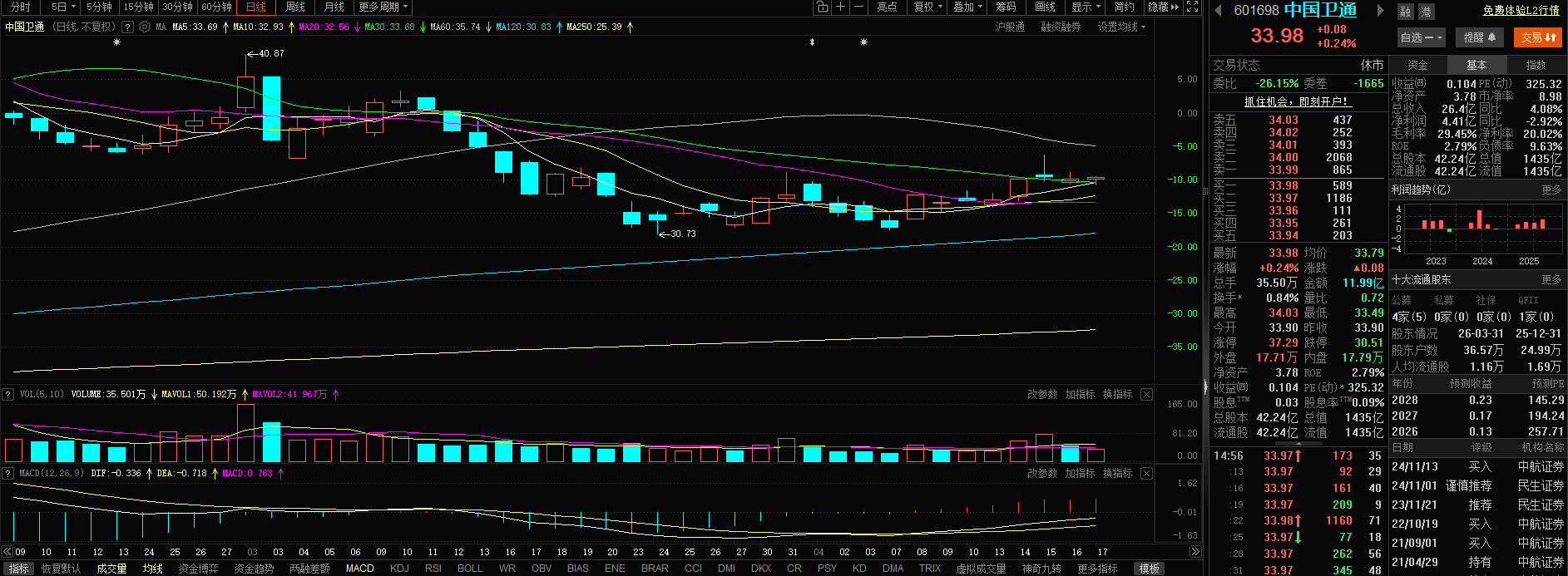 中国卫通:本周基本持平,收盘在34附近,较上周五的33.9变化不大。周初受卫星互联网消息刺激冲高至35.2,随后回落整理,后四个交易日缩量至地量水平。33.5元支撑被多次验证有效,抛压已明显减轻。老白没有操作,耐心等待催化。下周关注能否放量站回34.5上方,以及卫星互联网板块是否有新的消息刺激。若无催化,可能继续磨底。