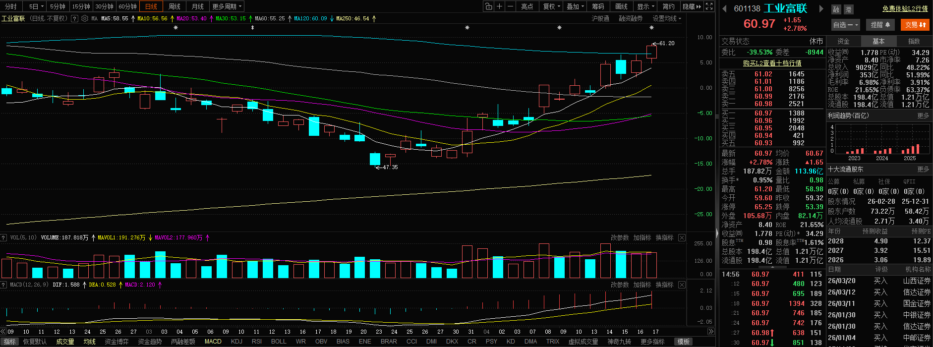 $工业富联(SH601138)$:本周表现最强,从周初的55.7涨至周末的61附近,周涨幅接近10%。周一放量反弹,周二小幅整理,周三回调后,周四周五连续上攻,成功突破60元整数关口,且收盘站稳。60元已由压力转为支撑,量能配合较为健康。老白没有卖出,继续格局。下周关注60元能否成为新平台,以及能否向63-65区域拓展。若放量突破,则空间打开;若回踩60不破,也是强势整理。