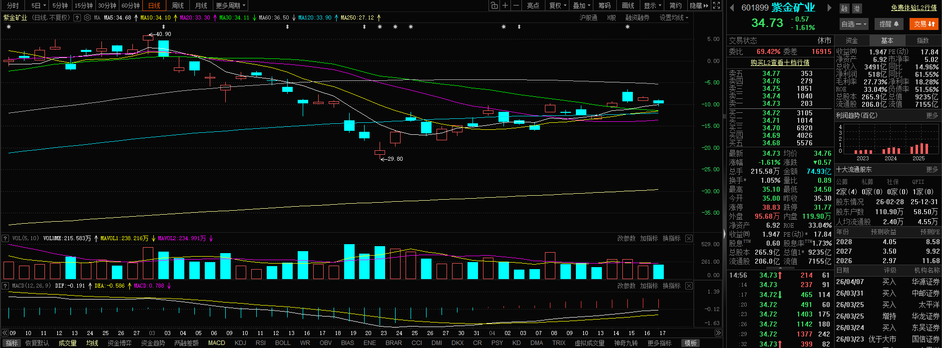 $紫金矿业(SH601899)$:本周整体偏弱,收盘在34.7附近,较上周五的33.9略有上涨,但周中波动较大。34.5元支撑被多次考验但尚未有效跌破。贵金属板块受中东消息面影响,走势跟着外盘大宗商品走,缺乏独立性。老白没有操作。下周需关注34.5的防守情况,以及美伊谈判进展对金价的扰动。若跌破34,会考虑减仓;若企稳回升,则继续持有。