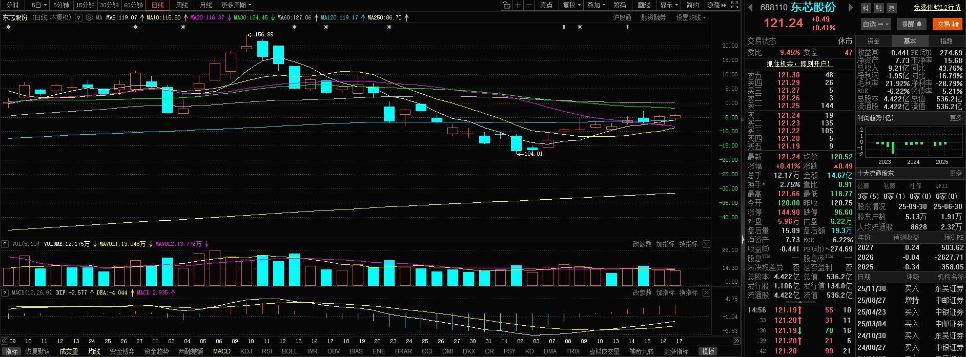 东芯股份:本周整体平稳,收盘在121附近,较上周五的116小幅上涨。周中盘中创出123元的新高,但冲高回落,说明上方抛压存在。120元关口反复争夺,周五收盘略高于120。量能温和,趋势未坏。老白继续持有。下周看120能否站稳,若能放量突破前高123,则上行空间打开;若回踩115-118区域,则属于正常整理。