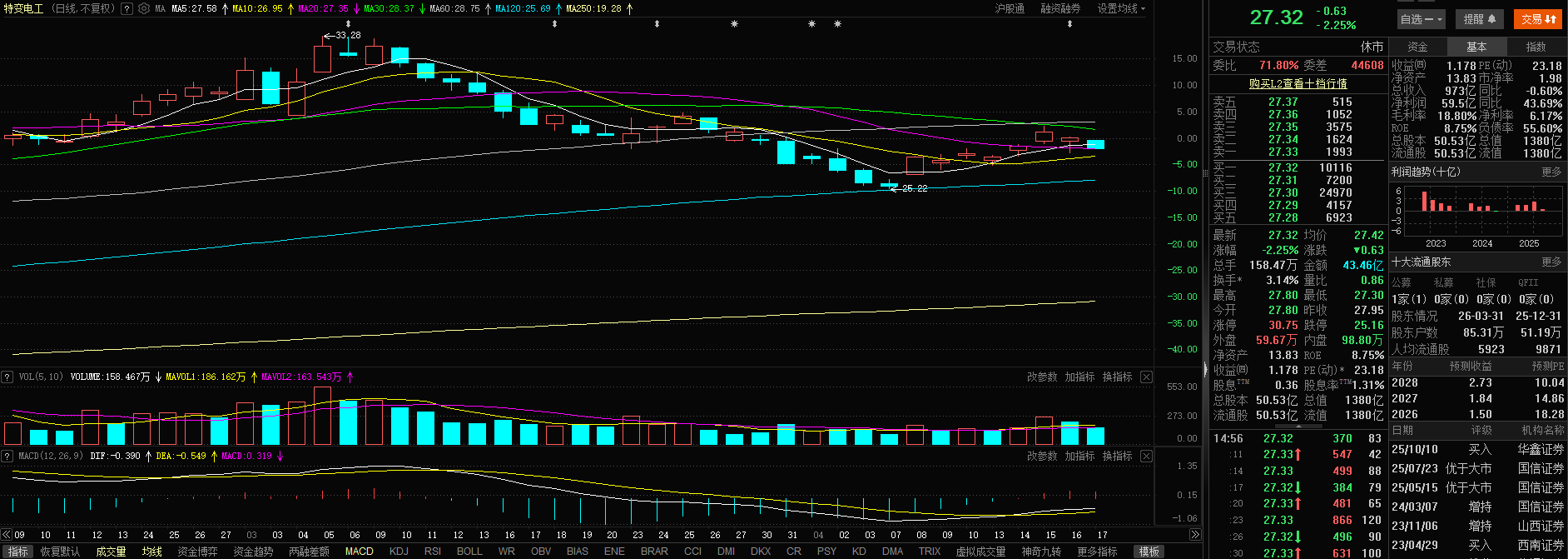 特变电工:本周表现偏弱,收盘在27.3附近,较上周五的26.9略有上涨,但周中波动较大,周五差点跌破27元整数关口。电网设备板块整体弱势,个股缺乏独立逻辑。老白没有卖出,但下周27元是重要观察点。若有效跌破27,会考虑减仓;若守住并温和反弹,则继续持有。