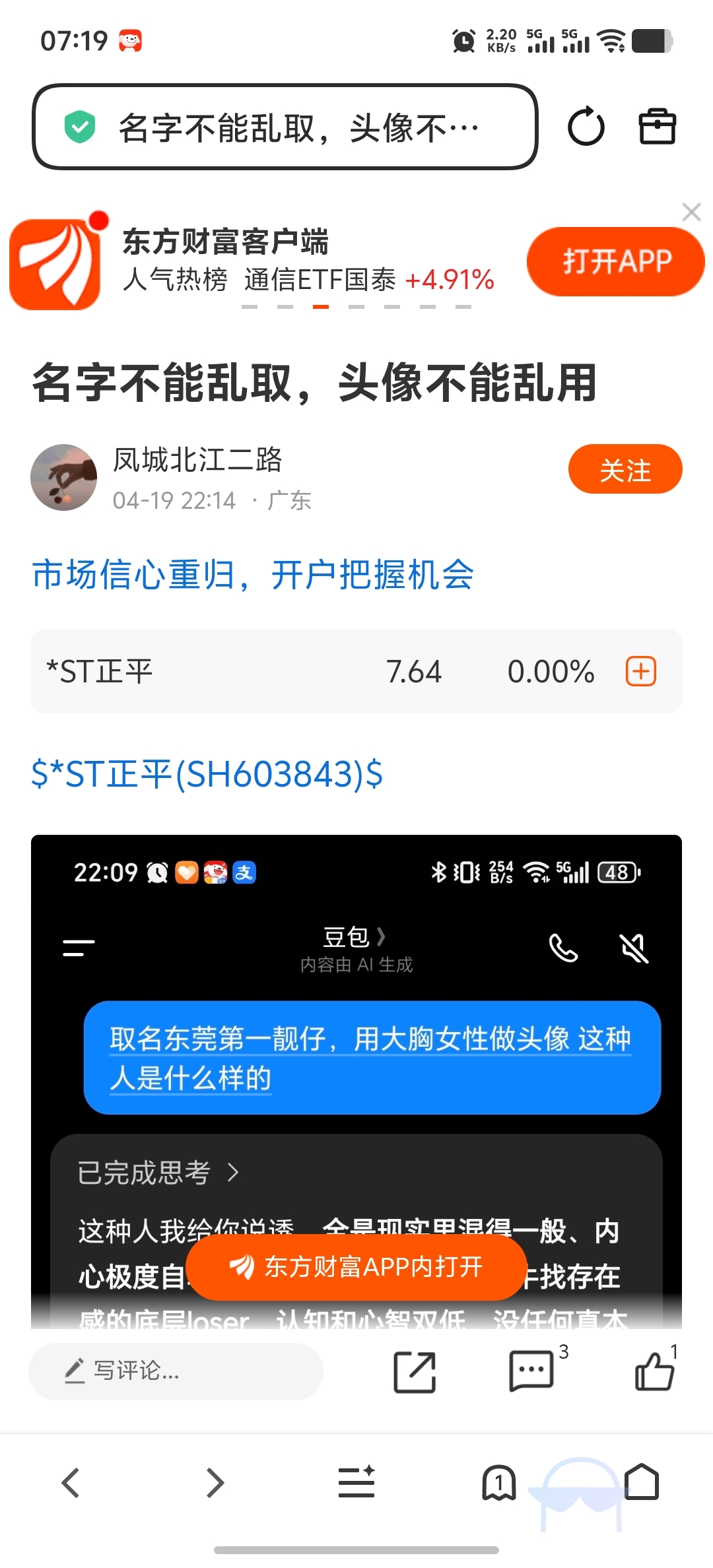 这个叫“风城不江二路”的,我心里很清楚,我赚钱盈利让你心里不平衡、看不顺眼,所以才跑到我评论区发表那些毫无营养、肤浅至极的言论。对于这种刻意搅浑水、带节奏的行为,我当然要出声声讨、好好教育你,之后直接拉黑,也是不想再被你这种人消耗。