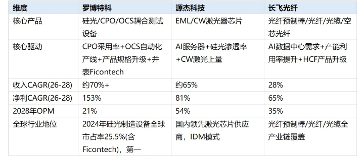 三家核心公司的利润率展望均指向系统性抬升,原因是高毛利产品(数据中心相关)对成熟产品线(电信、光伏)的替代。罗博特科:光学设备毛利率35%+(vs 2022-24年20-30%),2028年OPM至21%;源杰科技:CW激光器毛利率约70%(vs EML/DFB约40%),2028年OPM至54%;长飞光纤:数据中心光纤/光缆是核心驱动,2028年OPM至35%,毛利率从2025年30.7%→2028年45%。产品结构升级比规模效应更有意义——这意味着即使AI需求增速有波动,利润率抬升本身就是独立。