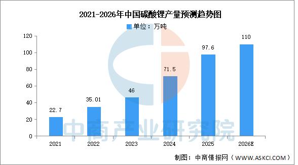 碳酸锂是锂离子电池的一种重要材料,主要作为正极材料使用。近年来中国碳酸锂产量呈现增长趋势,中商产业研究院发布的《2026-2031全球与中国电池级碳酸锂市场现状及未来发展趋势》显示,2025年中国碳酸锂产量97.6万吨,产量同比增长39.3%。中商产业研究院分析师预测,2026年中国碳酸锂产量将达到110万吨。