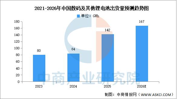中商产业研究院发布的《2026-2031年中国消费型锂电池行业市场前景预测及未来发展趋势报告》显示,随着消费电子的市场回暖,2024年中国消费锂电池出货量有所增长,达84GWh,同比增长5%,2025年约为142GWh。中商产业研究院分析师预测,2026年中国消费锂电池出货量将达167GWh。