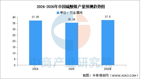 硫酸镍是制备锂电池正极材料的关键原料之一,在三元锂电池的制造过程中,硫酸镍与钴盐、锰盐等原料一起,通过一系列化学反应生成正极材料的前驱体,进而形成最终的正极材料。中商产业研究院发布的《2026-2031年中国硫酸镍市场调查与行业前景预测专题研究报告》显示,2025年中国硫酸镍产量约达35.34万金属吨,同比下降5.1%。中商产业研究院分析师预测,2026年中国硫酸镍产量将恢复增长到37.5万金属吨左右。