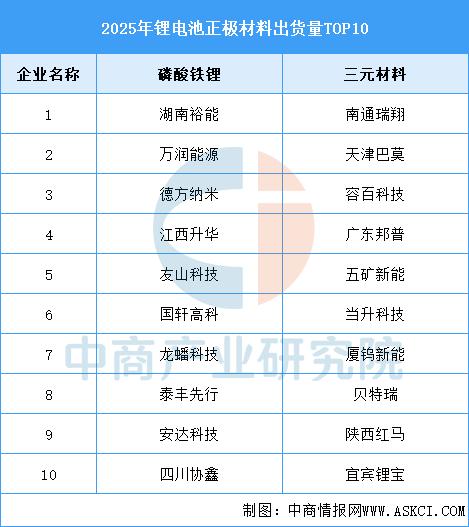 2025年,从企业出货量来看,磷酸铁锂正极材料企业湖南裕能以超过100万吨的出货量遥遥领先,已经连续多年排名行业第一,万润能源取代德方纳米排名行业第二,四川协鑫和安达科技取代金堂时代和融通高科进入前十。