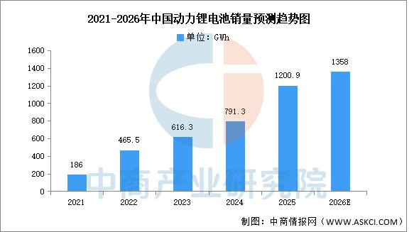 近年来,动力锂电销量持续攀升。中商产业研究院发布的《2026-2031年中国动力锂电池市场前景及投资发展战略研究报告》显示,2025年中国动力电池累计销量1200.9GWh,同比增长51.8%。中商产业研究院分析师预测,2026年中国动力锂电池销量将达1358GWh。