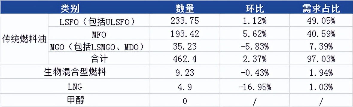 数据显示,3月传统船用燃料油中低硫船燃(LSFO、ULSFO)的销量为233.75万吨,环比增长1.12%。高硫船燃(HFSO)的销量为193.42吨,环比增长5.62%。MGO(包括LSMGO、MDO)的销量为35.23万吨,环比下降5.83%。