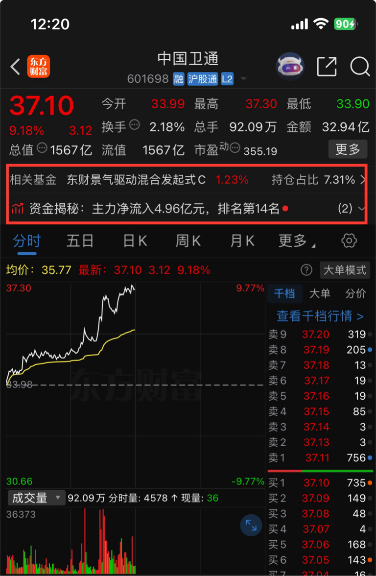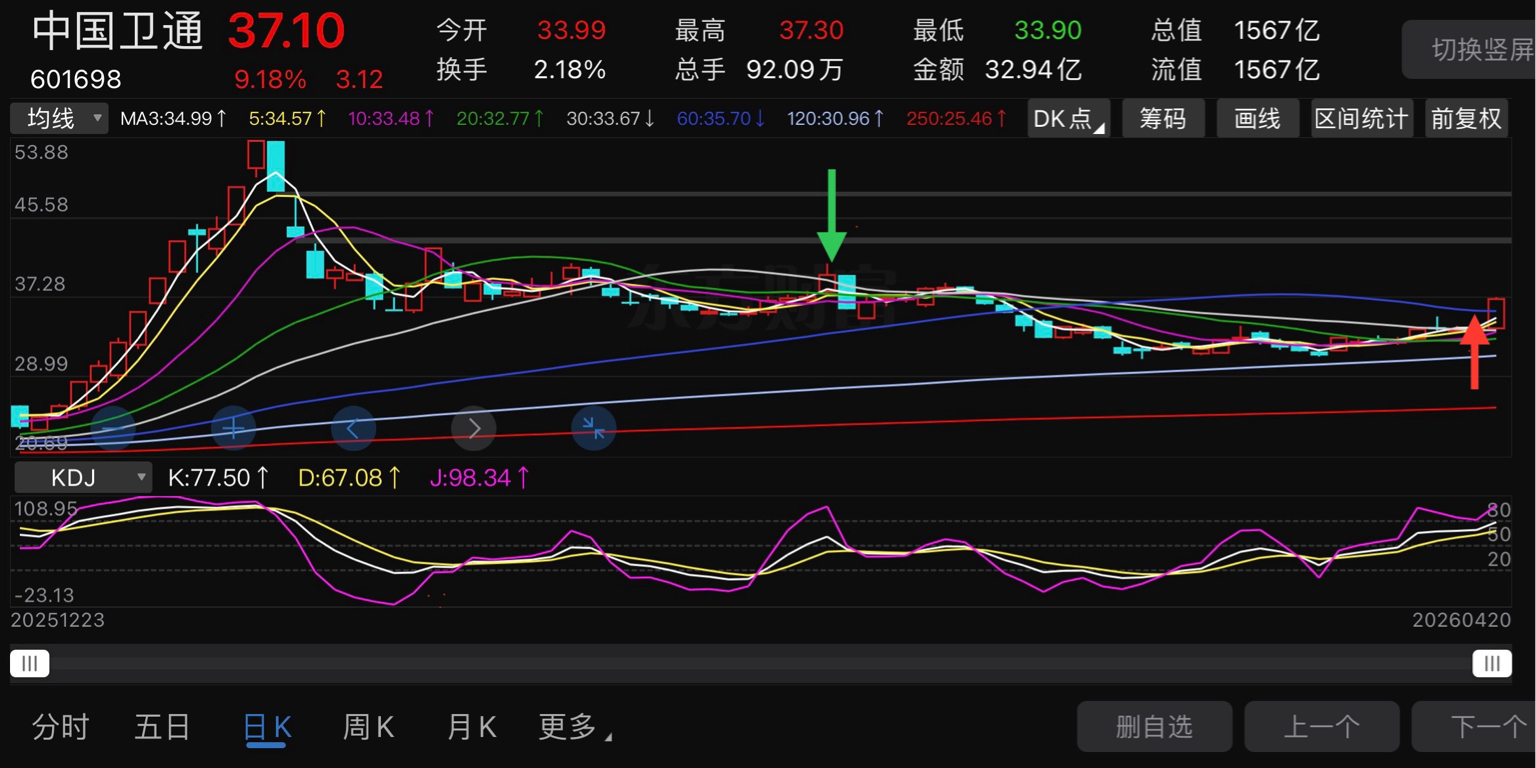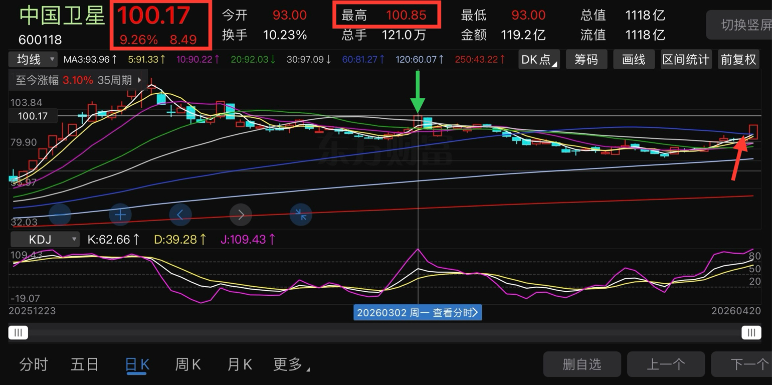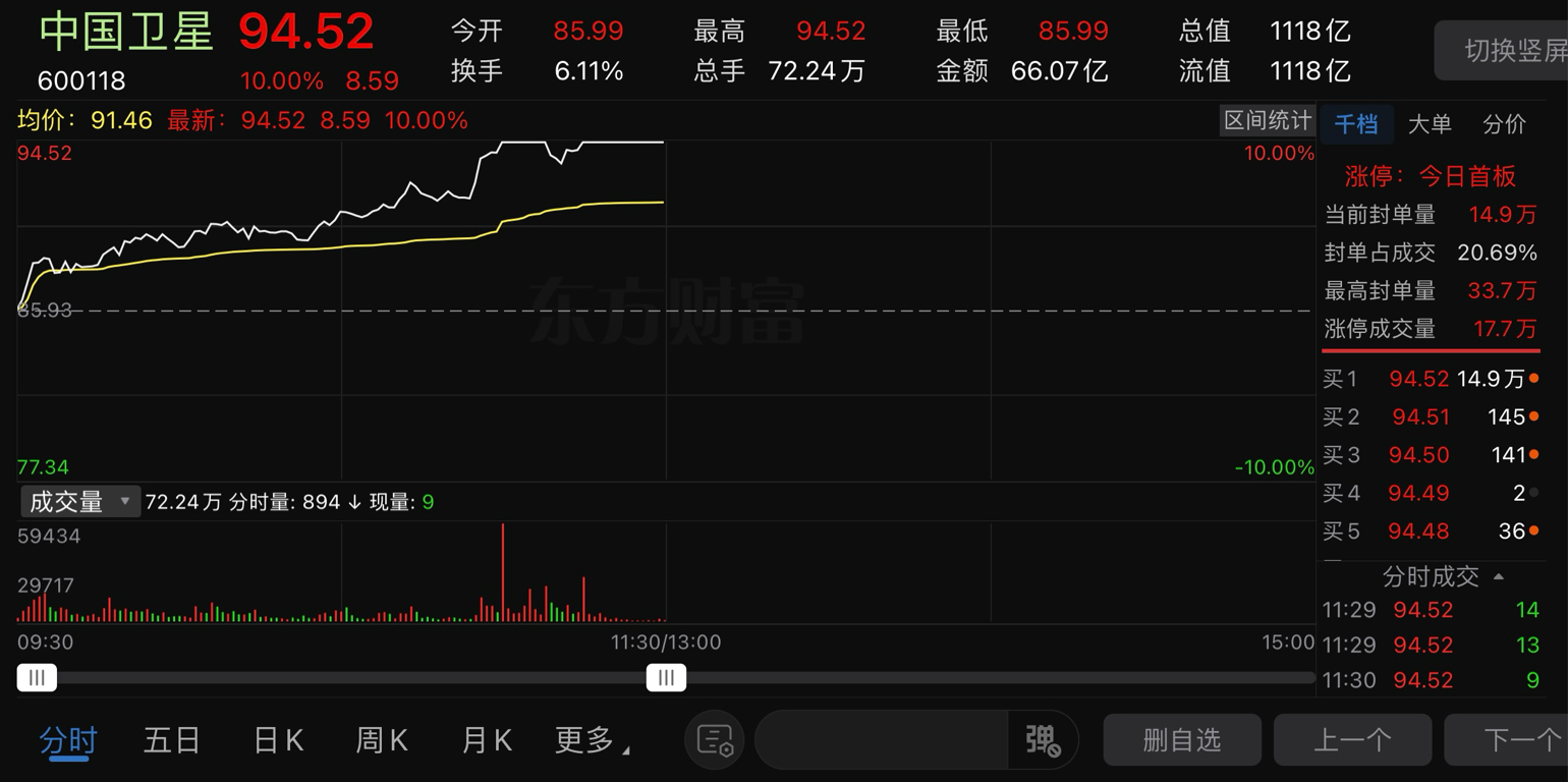 今天千亿市值的中国卫星涨停,中国卫通冲击涨停。
