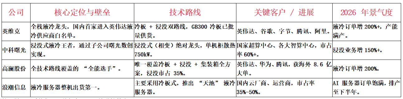 核心结论:冷板式是当前业绩放量的主力;浸没式是代表未来的终极方案,正在从超算走向商业数据中心;喷淋式暂不构成主流投资方向。