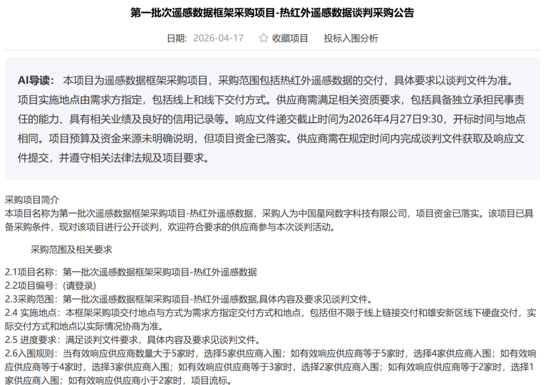翻看采购公告的时候,看到一条有意思的信息:中国星网数字科技有限公司正在招标热红外、雷达、光学这些遥感数据,而且是第一次做全品类的框架采购。