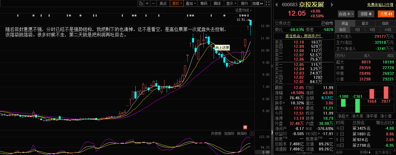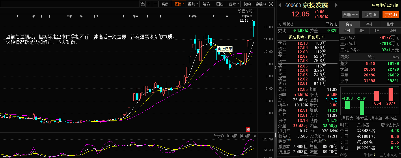 但我高看了京投发展这条周末消息线,这一点是错的。消息很热,盘口却不买账,早盘冲一下,后面一路回落,典型的情绪不接力。