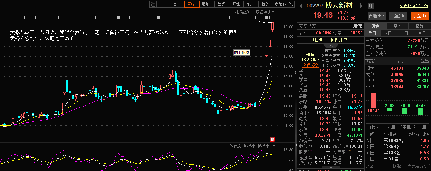 前几天一直在观察,这票强,但没有舒服的位置我不会去追。今天早盘给了换手,也给了分歧,重新回到板边,这就是机会。