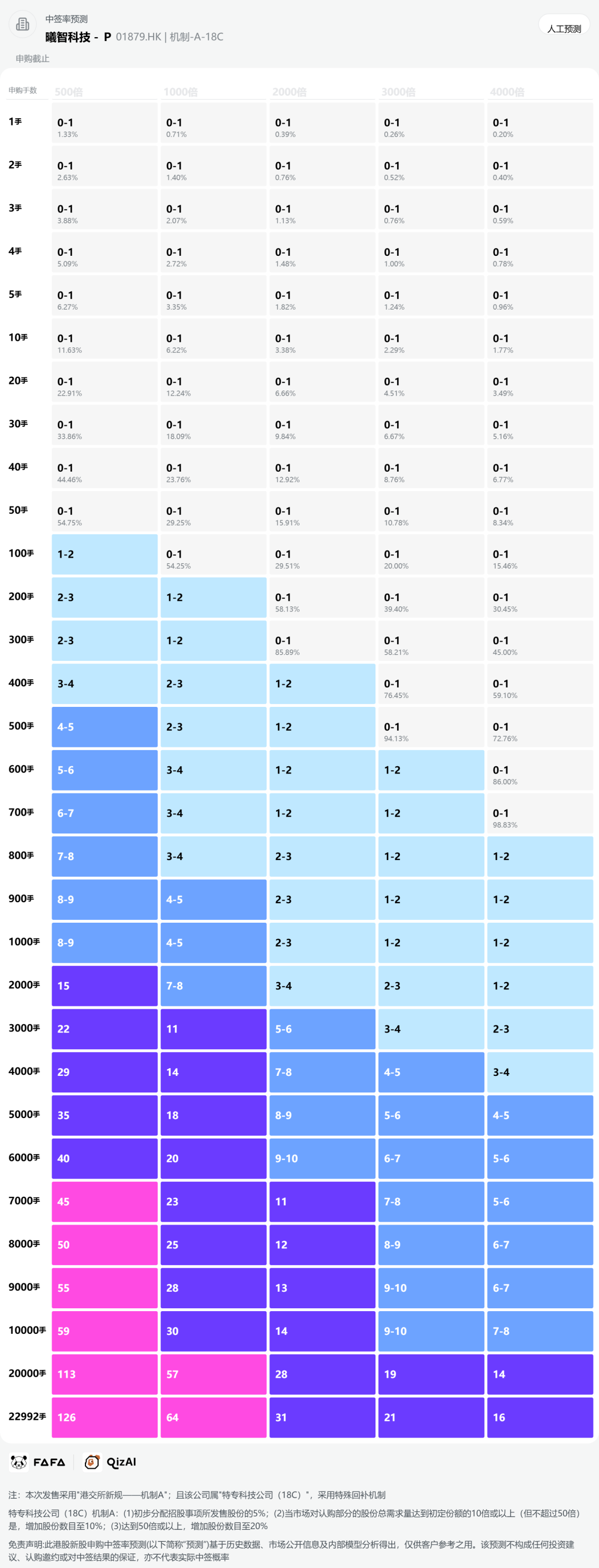 曦智科技-P采用机制A,回拨5%:公开发售:68.98万股,发行手数:45985手;回拨10%:公开发售:137.96万股,发行手数:919970手;回拨20%:公开发售:275.92万股,发行手数:183940手;甲尾申购需要28万本金,乙头申购需要56万本金;曦智科技-P跟迈威生物-B冲突,资金2选1,现在倍数是130倍了,预计最终会在2000倍左右,最终发行手数有18w多,中签机会极高;由中金和海通联合保荐,有基石,有绿鞋,历史保荐项目可以。