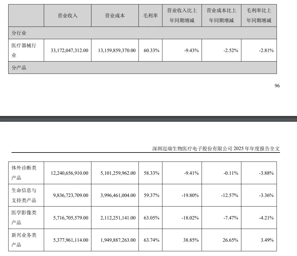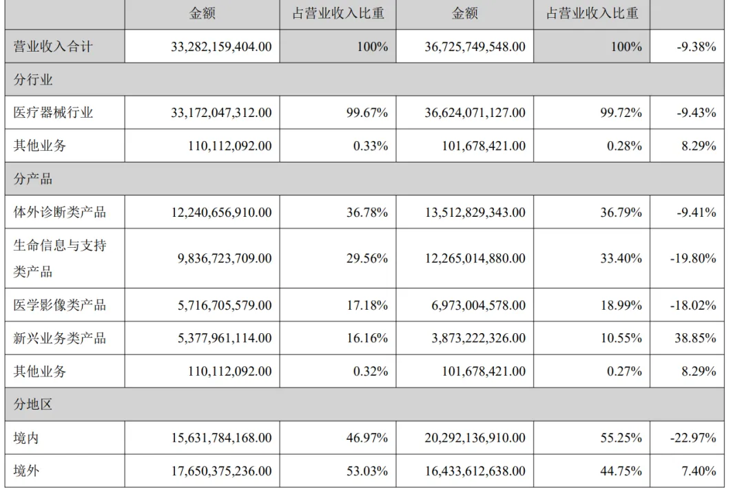 国内市场,报告期内,公司国内业务实现收入 1,563,178.42 万元,同比下降22.97%。国内医疗设备行业历经了过去连续三年的深度调整,最困难的时刻已经过去。医院当前和未来一段时间仍广泛面临经营压力带来的整体采购预算缩减,因此近期设备行业仍处于弱复苏阶段。受DRG/DIP 支付方式改革、试剂集中带量采购、检验结果互认、医疗服务价格治理等多重政策影响,体外诊断行业进入调整收缩期,试剂用量和价格均出现了不同程度的下滑,导致市场规模出现较大幅度萎缩。上述政策的实施虽然带来了短期的行业波动,但有效规范了诊疗行为,提升了医保支付效率,也对医疗机构的诊疗能力提出了更高的要求,这正是公司发挥创新能力、提供价值医疗、抢占市场份额的历史机遇期。因此可以看到,在行业集中度和进口替代率加速提升的趋势下,公司体外诊断业务的市场占有率获得明显增长。报告期内,国内新兴业务也表现出高增长潜力,与体外诊断业务的合计营收占国内业务营收的比例达到近七成,而这些业务将是国内长期快速增长的重要驱动。2026 年全年公司国内业务有望实现正增长,2027 年及之后将有望进入更加稳定的持续快速增长阶段。