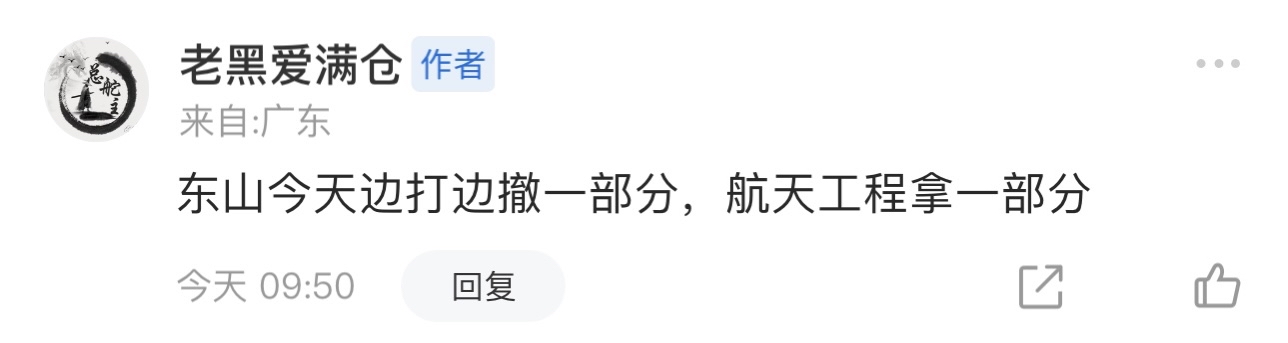 东山清完后,按计划低吸航天gc,目前手上就只有这两个标的了,今天没拿下本周的开门红,后面继续加油!