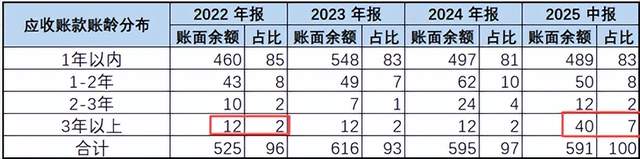 新业务没有什么起色,过去已经成为营收的账款还要不回来,通宇通讯的3年以上账龄的应收账款从2022年的1200万(占比2%)暴涨233%至2025年中期的4000万(占比7%),回款压力巨大。