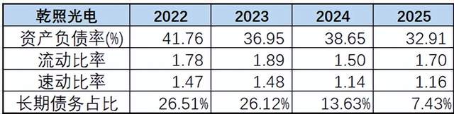 乾照的资产负债率从2022年的近42%降低到2025年的33%,流动比率与速动比率分别达到1.7和1.22,偿债能力稳健的同时,债务占比也减小到了2025年的7.4%,没有债务的压力让公司能够更加游刃有余。