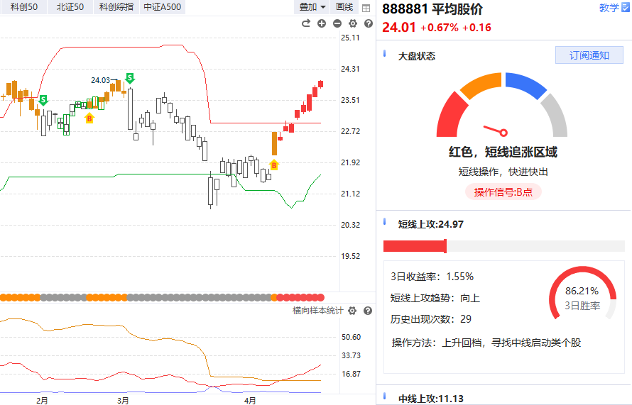 牛线走平,熊线上移,平均股价短期趋势为震荡趋势,中期趋势为上升趋势。平均股价维持B点,大盘状态为红色,短线追涨区域,短线操作,快进快出。