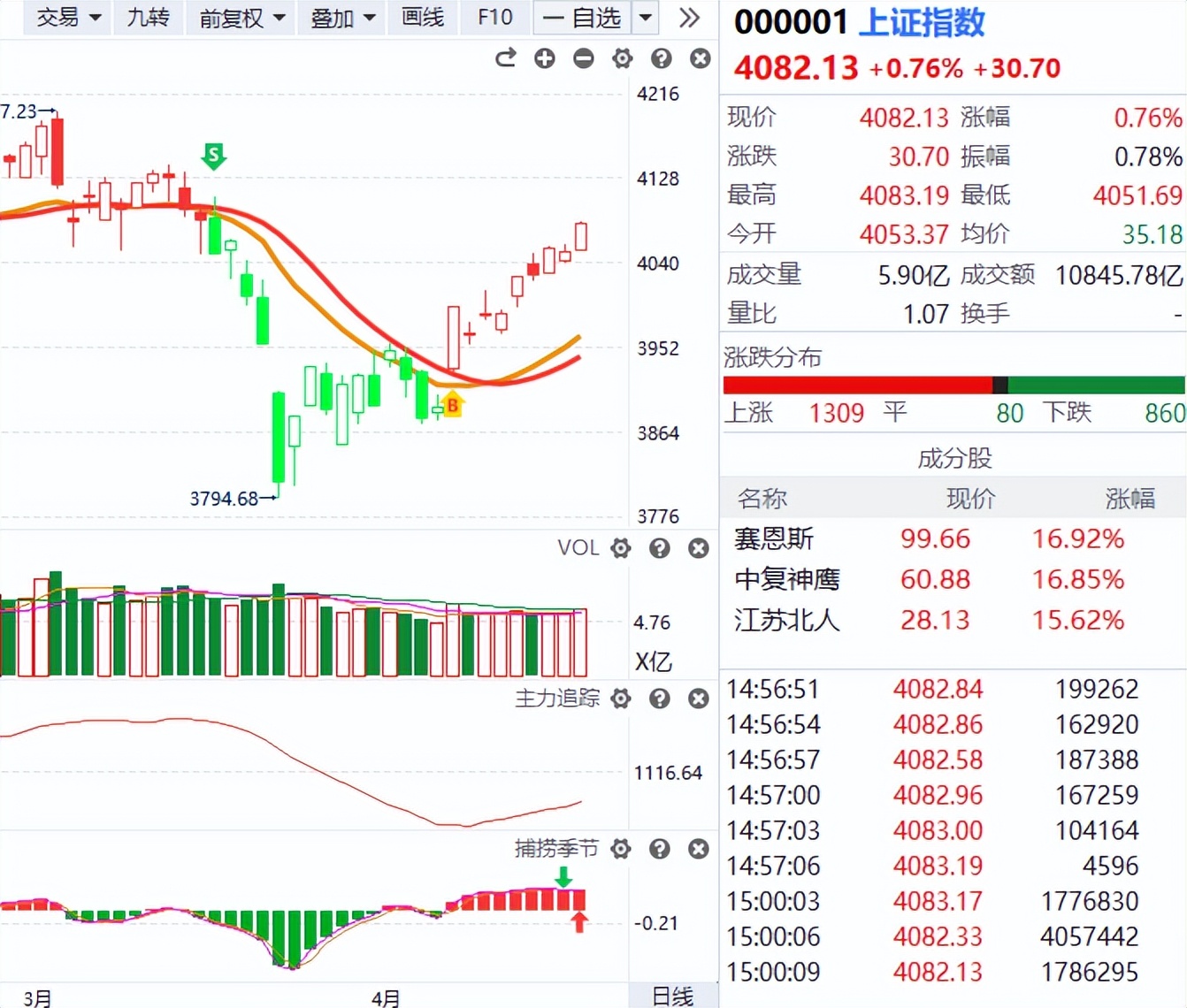上证指数继续高歌猛进,市场放量逾1500亿元,两市成交突破2.5万亿元。量升价增,市场迎来一波不错的短线行情。本轮短线赚钱效应自4月7日启动,除中间短暂调整两天外,实盘赛选手几乎每日都能实现正收益。这说明行情具备持续性,且真正的行情往往源于外部利空砸出的黄金坑。试想,如果没有地缘政治事件(美伊战争)的扰动,指数可能处于高位盘整,市场缩量震荡,量化资金每日拉动十余个方向,资金一追高就容易被动。因此不必惧怕下跌,市场有时候恰恰是跌出来的机会。