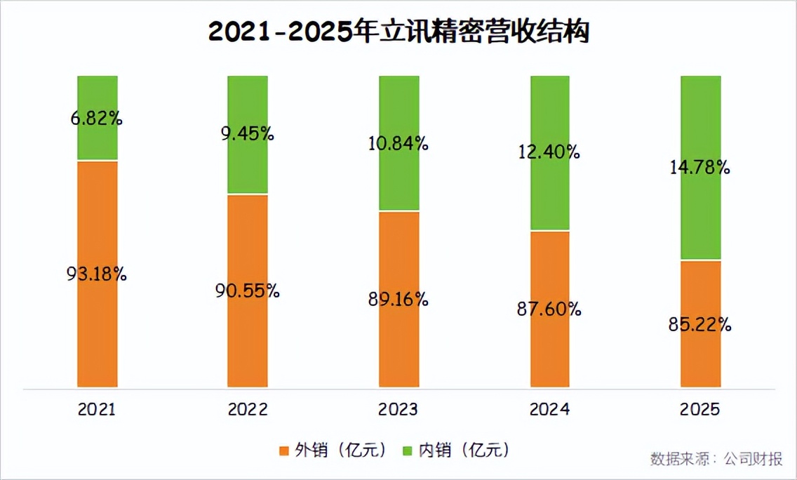 2025年,立讯精密在国内实现营收491.36亿元,在总营收中的占比不过14.78%;而其在海外圈了2832.09亿元,在总营收中占了85.22%,这一比例长期稳定在90%左右。