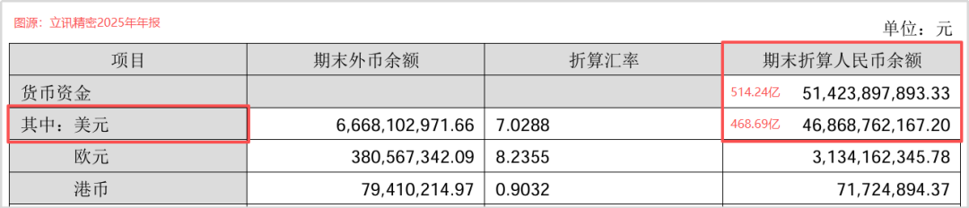 2025年底,立讯精密账上的外币可以折算为人民币514.24亿元,在其611.59亿元的货币资金中,占了85.08%;这其中,有66.68亿美元,约合人民币468.69亿元。