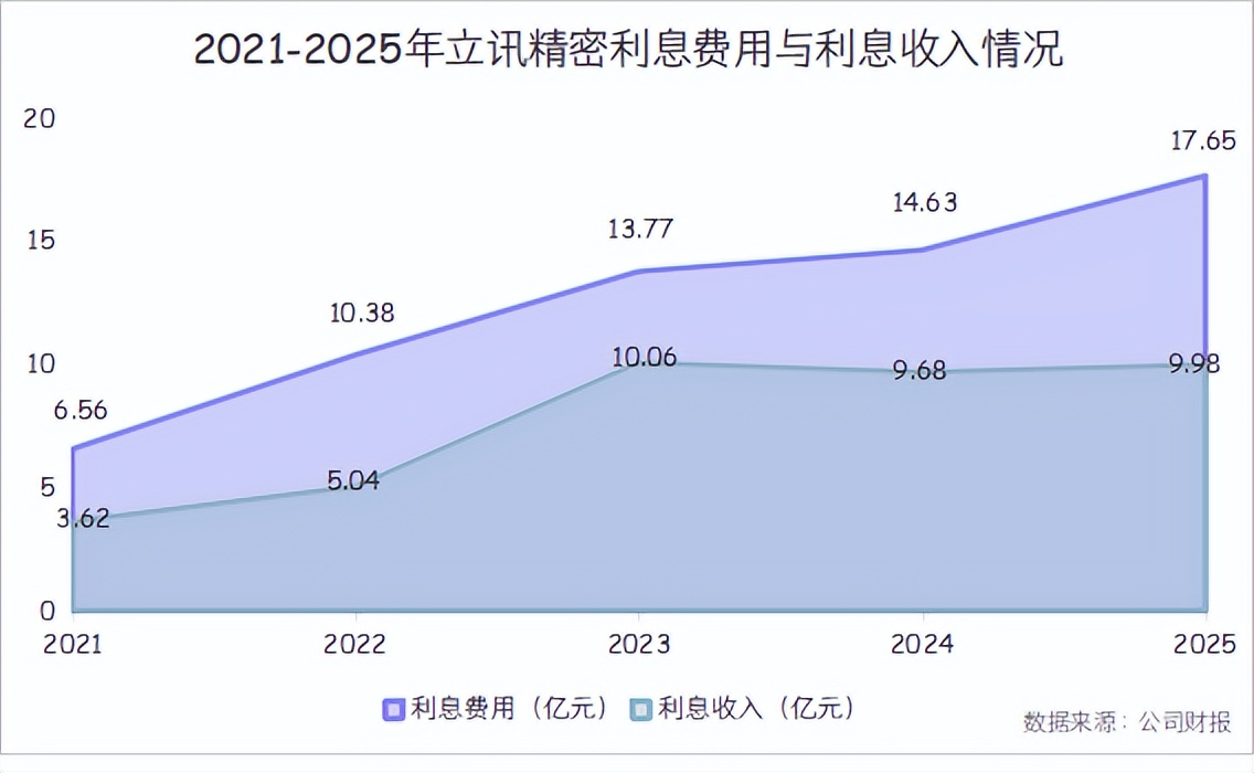 长期以来,立讯精密的利息费用都明显高于利息收入,并且两者之间的差值还在扩大。2025年,公司的利息费用和利息收入分别为17.65亿元和9.98亿元,两者相差7.67亿元。