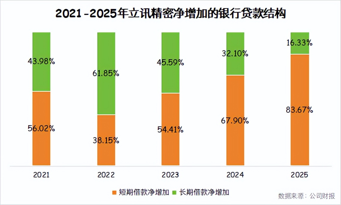2025年,在立讯精密净增加的296.71亿元的有息负债中,有248.25亿元都是短期借款,占了83.67%;长期借款只有48.46亿元,占了16.33%,比上年低了近20个百分点。