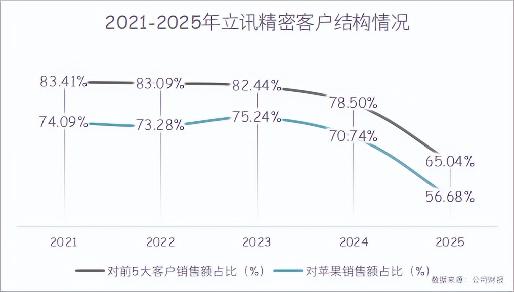 2021-2025年,公司对苹果的销售额在总营收中所占的比例从74.09%,一路直降到了56.68%,连带着其对前5大客户的销售额占比,从83.41%下降到了65.04%。