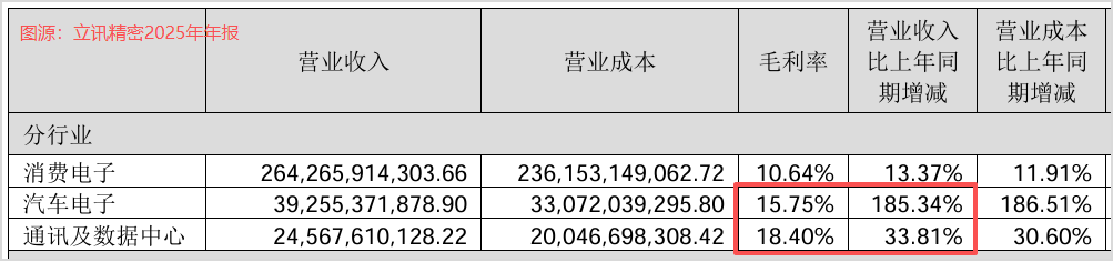 2025年,立讯精密的通讯及数据中心业务实现营收245.68亿元,同比增长33.81%;这一业务的毛利率比汽车电子还高,有18.40%。