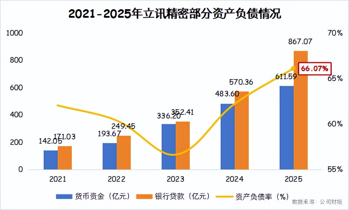 2025年底,公司账上有611.59亿元的货币资金,同比增长26.47%;同时,其银行贷款(短期借款、长期借款及一年内到期的长期借款),竟达到了867.07亿元,同比大增52.02%,资产负债率也顶到了66.07%历史高值。