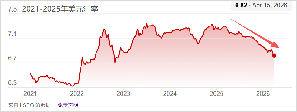 因为2025年以来,美元汇率下降趋势明显。2026年4月17日,1美元就只能换回来6.82元人民币,比2025年年初少换差不多0.5元。