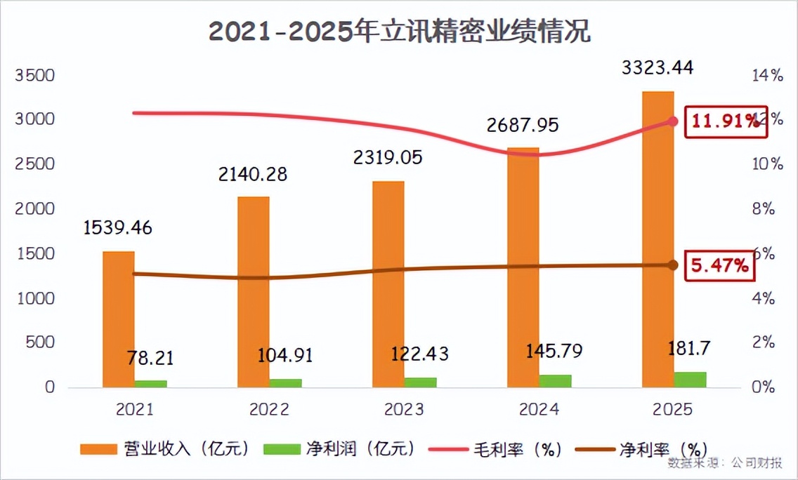 2025年,立讯精密实现营收3323.44亿元,差不多是平均每天能赚10亿元,但全年净利润只有181.70亿元,毛利率和净利率分别只有11.91%、5.47%。