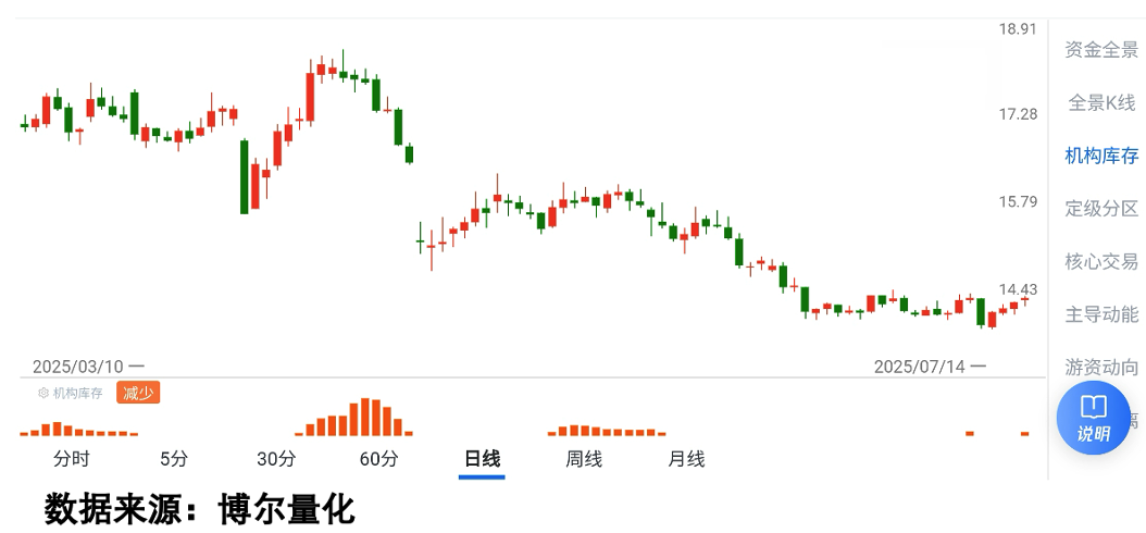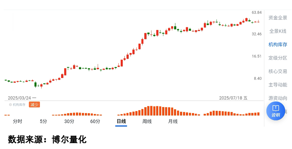 其实机构布局的时候,大多不会大张旗鼓拉涨,毕竟要是所有人都看出来这只有资金在做,都来抢筹码,机构的成本就高了,所以很多时候会压着价格慢慢磨,走势看上去不死不活,跟被市场遗忘了一样,实际底下机构一直在积极交易。还有一只当时的大牛股就是这样,启动前的走势特别磨人,横盘很久都没动静,没几个人能拿得住,但看数据就会发现,这段横盘期里「机构库存」一直都在,说明机构从来没停止参与。看图3: