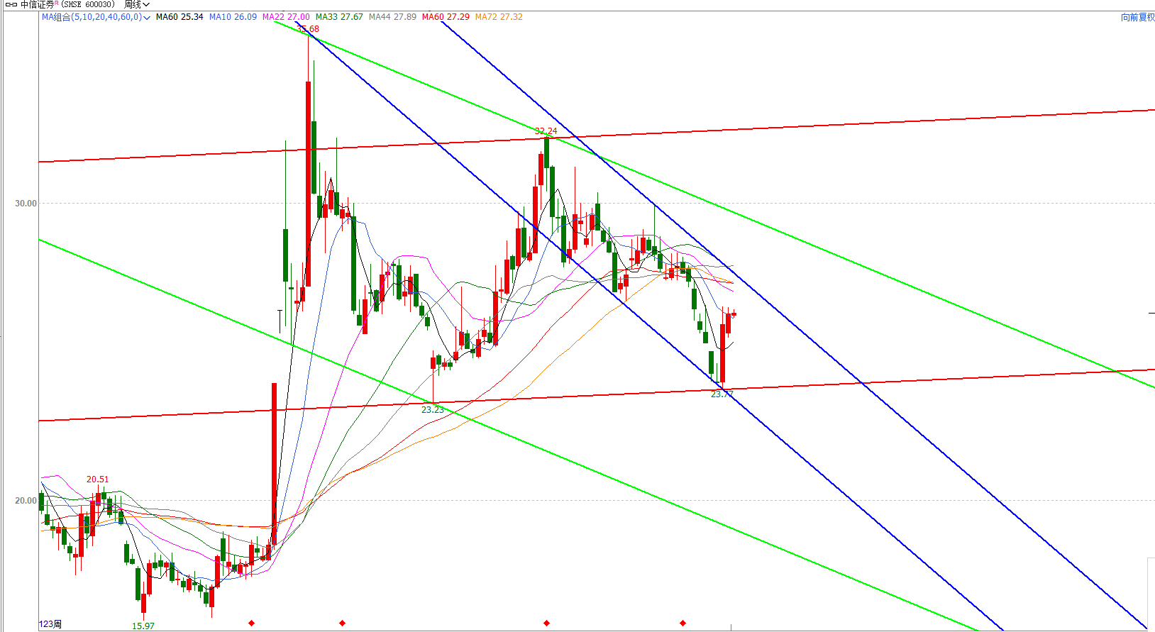 投资标的现在的状态是在首先在蓝色的阻支区间内震荡下行,然后在绿色的阻支区间内震荡下行。投资标的向上突破蓝色的阻支区间的重要标志,是投资标的上升的第6周,突破价格27.07。换算成时间,应当是在5月15号所在那一周。这是在事中判定投资标的在绿色的阻支区间内波动的重要信号。如果投资标的在绿色的阻支区间震荡上行,那么投资标的的目标价格应当是到28.9。上升时长为22个星期或30个星期,现在已上升4个星期。如果投资标的向上突破绿色的阻力区间,则在红色的阻力区间内震荡上行。所能到达的价格大概是32元钱。而如果投资标的在红色的阻支区间内震荡上行的话,那么它上升的波动时长只有22个星期。投资标的能不能在6月中旬之前向上突破绿色的阻支区间,也就是28.9,如果能突破,就在红色的阻支区间内震荡上行。那么投资标的价格就有可能达到32.46元,如果在6月中旬投资标的还在28.9之下,那么大概率投资标的是在绿色阻支区间内震荡上行。