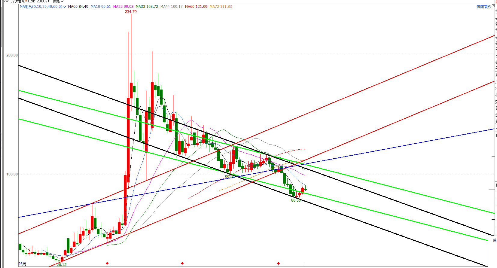 为投资标的设立黑色的阻支区间、绿色的阻支区间,红色的阻支区间,还有一条蓝色的阻支线。投资标的应当现在在绿色的指数区间内震荡上行。向上突破绿色的走势线以后,预警下跌趋势可能结束。根据价格波动的规律性,80块钱形成的底部应该是有效底部,反弹时长应当大概在9个星期,现在已反弹,现在是第4个星期。本次反弹的高度大概是103元左右。