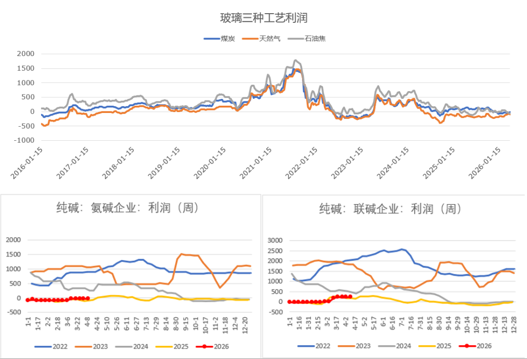 当前玻璃全行业深度现金流亏损、纯碱部分工艺有利润。浮法玻璃天然气、煤制、石油焦产线全面亏损,天然气产线吨亏近 90 元,行业持续现金流净流出、资金链紧绷,熔窑刚性停产成本极高导致被动冷修、难以主动减产,纯碱低价持续拖累玻璃成本支撑;纯碱行业利润极端分化,天然碱法高盈利、联碱法依托氯化铵副产保持盈利、氨碱法持续亏损,低成本产线维持高开工、亏损氨碱装置硬扛生产,整体行业盈利重心下移,玻璃需求疲弱持续压制纯碱价格与盈利修复,上下游利润共振走弱、暂无明显改善拐点。