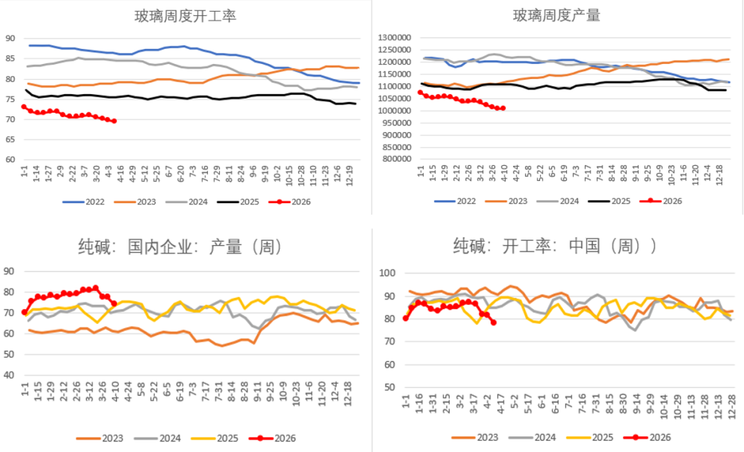 纯碱供应端新增产能持续释放产量众,,开工率回升,供应压力空前。截至 2026 年 4 月,国内纯碱产能突破4460 万吨,远兴能源二期 280 万吨天然碱、新都化工 70 万吨联碱产能持续达产,全年仍有 350 万吨新增产能落地。纯碱4 月以小规模分散检修为主,对供应收缩几乎无支撑;5 月计划集中检修 300 万吨产能,为远月供应带来边际改善预期,但供应过剩的实质并未改善。天然碱成本优势显著,行业整体即便亏损仍维持高开工。