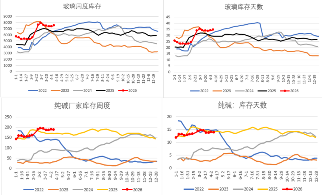 当前玻璃、纯碱厂库社库双高、全产业链库存堰塞湖、去库全面受阻。浮法玻璃样本厂库7652 万重箱、库存天数 34.8 天,同比 + 17.58%、连续三周累库,中游贸易库存同样高位饱和,下游深加工订单疲软、仅刚需拿货,库存持续积压难去化;纯碱厂家厂库187.94 万吨(历史同期高位),叠加社会库存超 35 万吨,重碱库存占比过半、对应玻璃采购疲弱,纯碱供应高位、下游消耗不足,库存窄幅波动、去库极慢,整体呈现玻璃高库压价、纯碱高库压制反弹、上下游库存共振走弱的格局。