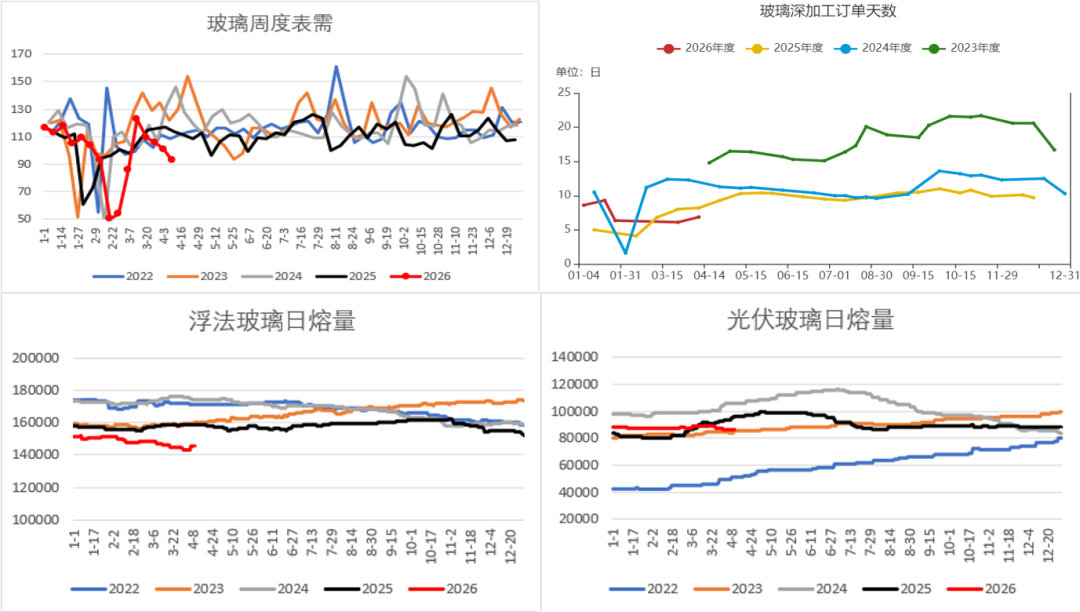 当前玻璃纯碱整体需求全面疲软、旺季不旺、刚需弱采购、无补库动力、上下游负反馈循环:浮法玻璃受地产竣工同比大降 25% 深度压制,深加工订单仅 7.33 天、处于历史低位,行业深度亏损、日熔量维持近十年低位,出货持续偏弱、仅刚需提货;光伏玻璃同样亏损减产、开工下行,两大玻璃主线共同拖累纯碱最大重碱需求;纯碱下游整体按需低补、重碱消耗持续低迷,轻碱及出口小幅边际改善但体量有限,完全无法对冲玻璃端需求下滑,整体呈现玻璃需求塌缩压制纯碱、下游持续去库观望、需求无实质性回暖的弱势格局。