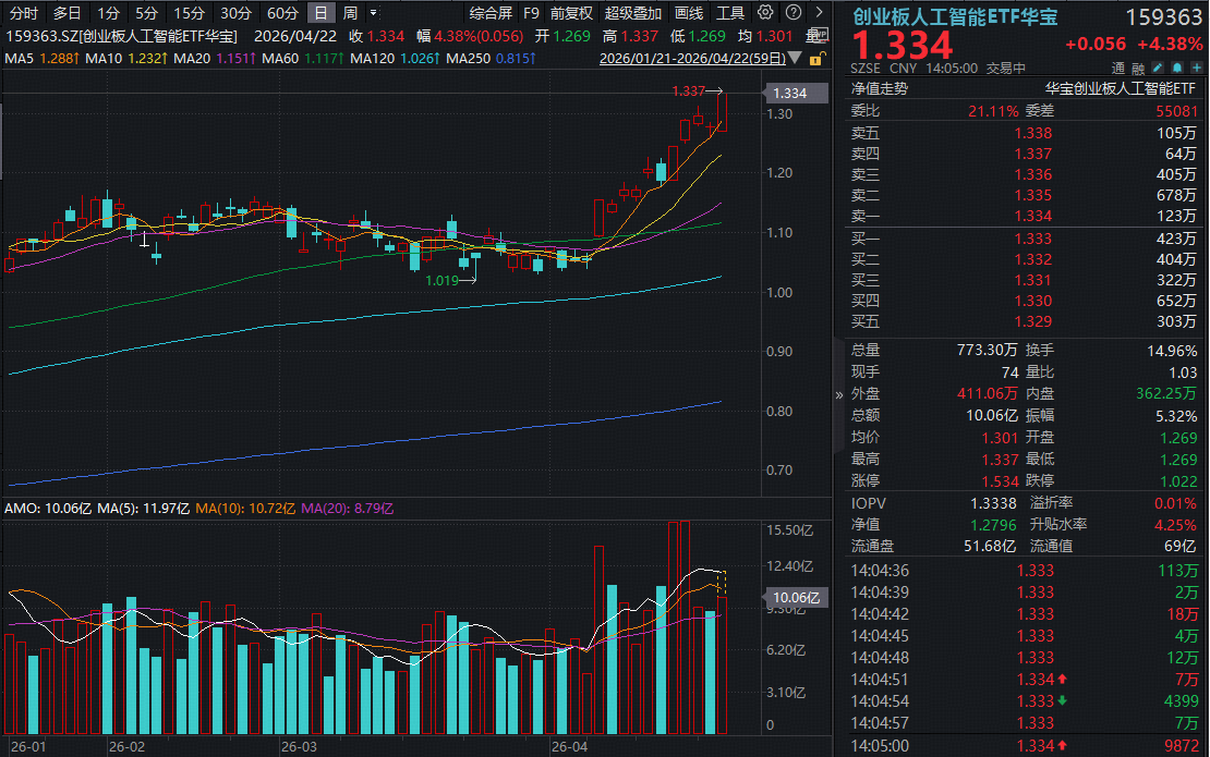 热门ETF方面,重仓光模块龙头“易中天”的创业板人工智能ETF华宝(159363)午后大涨超4%再创新高,爆量成交超10亿元!