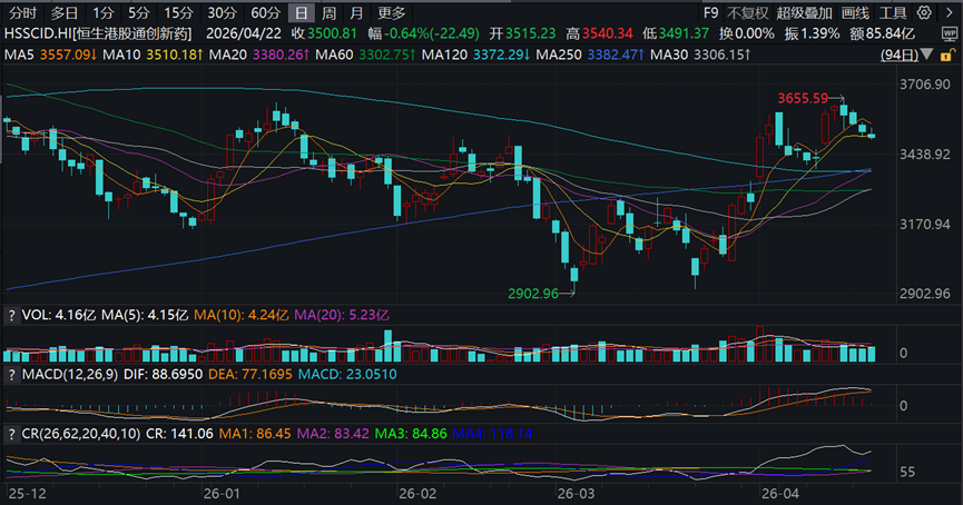 港股通创新药,今天低开低走继续调整,离下方20日均线支撑还有一点点距离,不过A股创新药已经提前触及20日均线支撑位了,不知道能不能带一带港股创新药,不然可能还是要碰20日均线反弹,目前依然偏乐观。