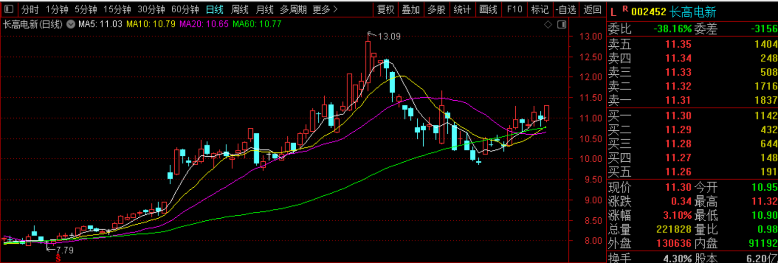 长高电新:昨天反包了阴线,上方有个平台压力,今天向上,量能没跟上,明天如果不能放量向上就离场了。