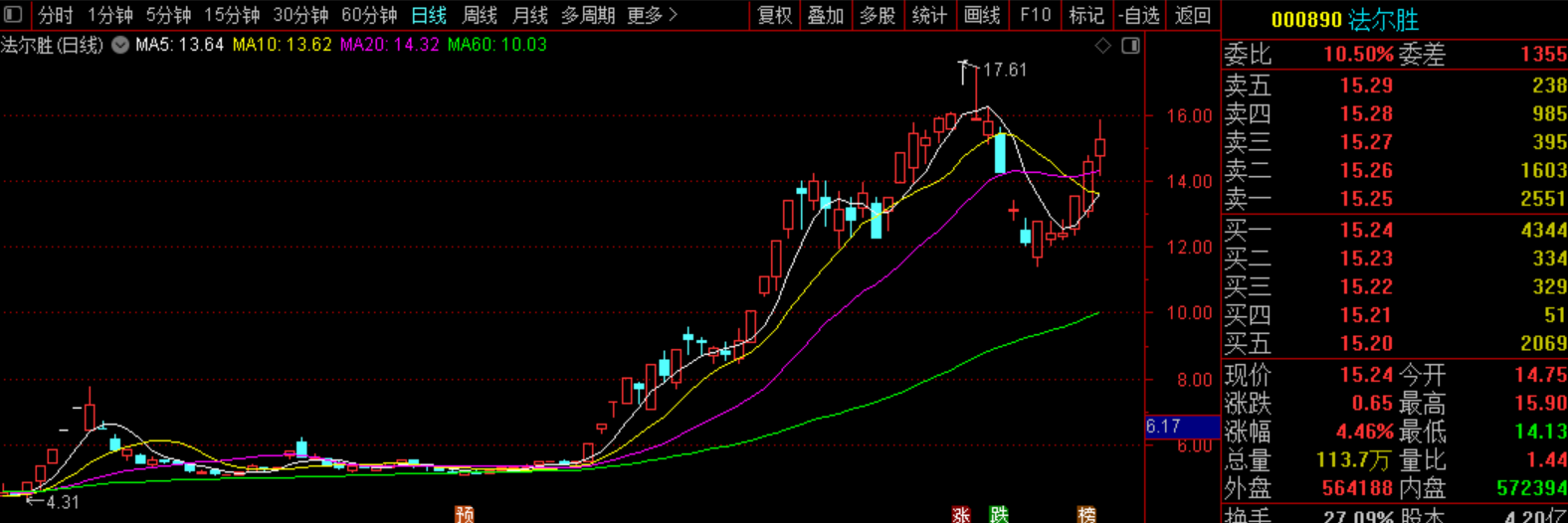 $法尔胜(SZ000890)$它前高有压力,昨天回落下来,短期应该要走震荡修复下,可以拿完今天观察一下。