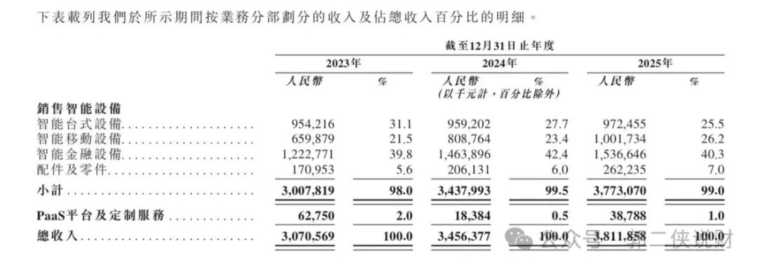 硬件销售占比常年维持在98%以上。其中,移动终端(手持设备)是主力军,贡献了约60%-65%的营收;台式终端占比约25%-30%。