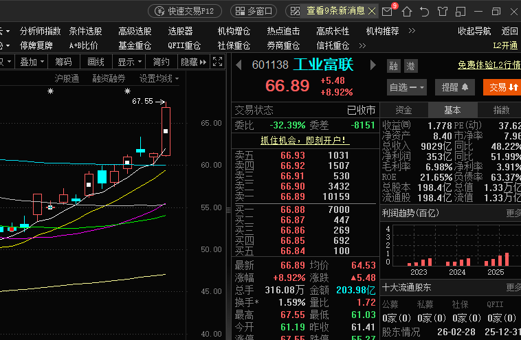 先来复盘一下昨天的走势,低开高走后大暴涨,市值干到1.33万亿,富联是AI这条线的总龙头,只要AI不停,它就难跌,不要乱追高,回踩的时候低吸更稳,今天的话趋势没坏资金还在往里冲,如果今天继续冲高的话继续持有,回落的话要是跌破64分批减仓。